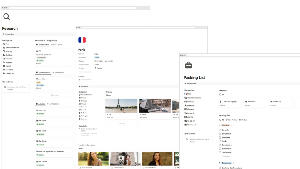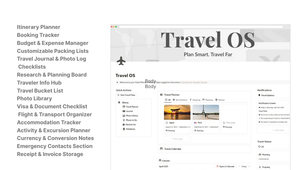 Travel OS is your all-in-one Notion template built to help you plan every detail of your trip — from itineraries and bookings to budgets and journals — all in one clean, easy-to-use dashboard.